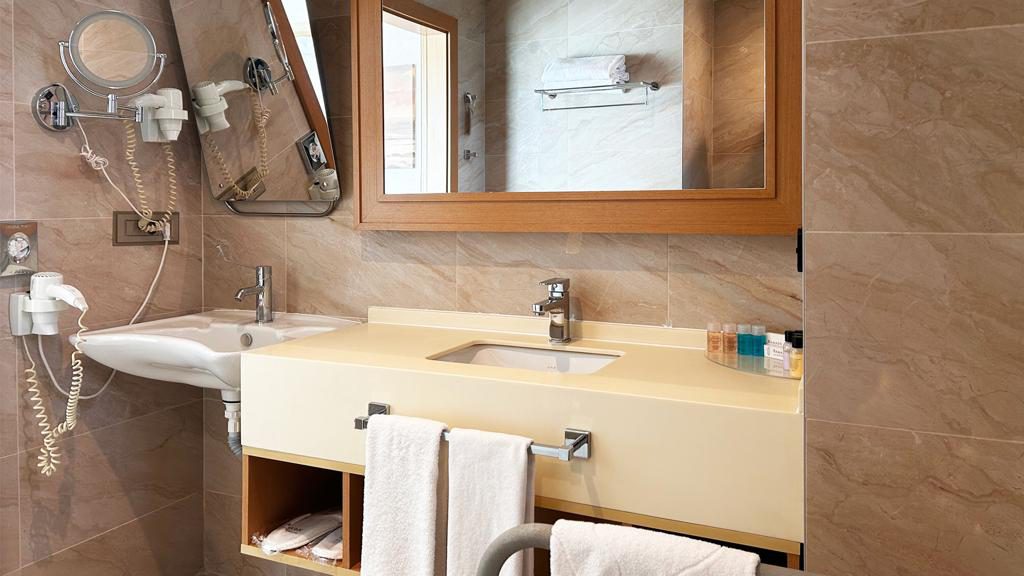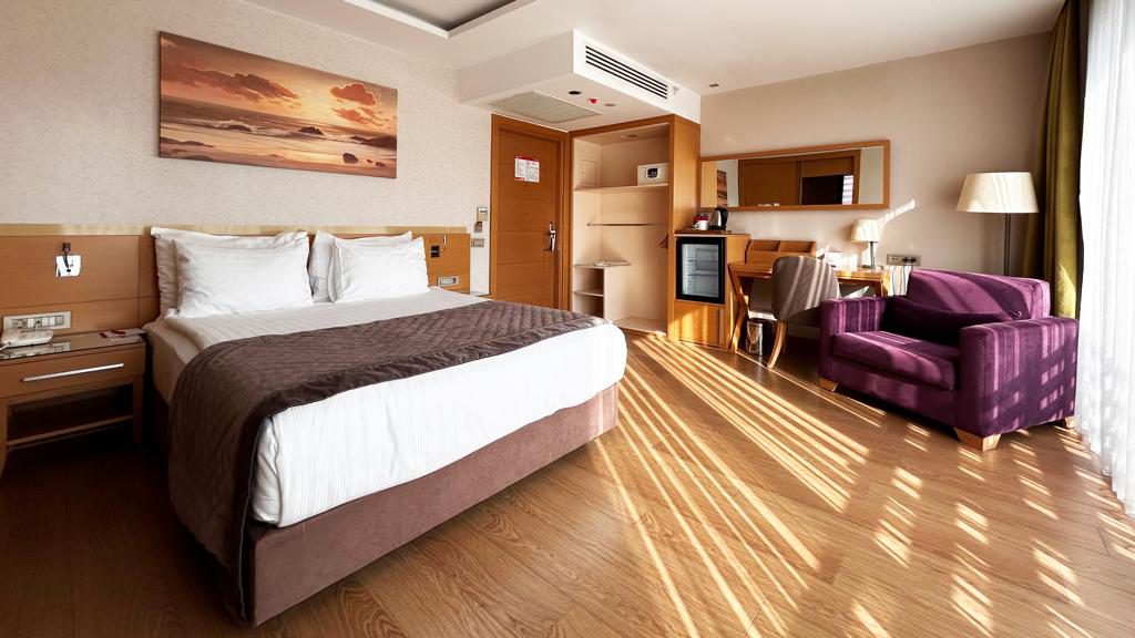 Our handicapped room is a corner room and is 28 square meters. It can accommodate up to three people. It has a single large bed.